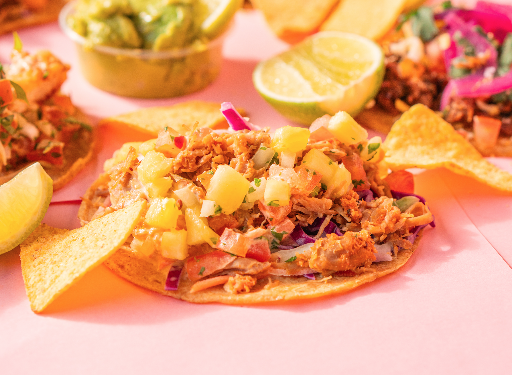 Al Pastor Taco: Saftigt svinekød marineret i krydderier og tilberedt til perfektion, kombineret med løg, ananas, et strejf af lime, frisk koriander og en cremet dressing.